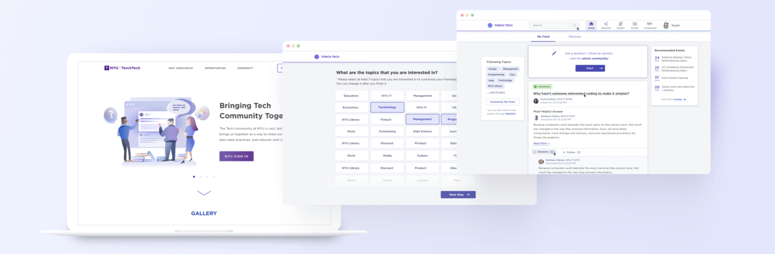 Following the usability testing, we improved the designs based on user feedback. For example, we added NYU violet to the color palette. We also curated posts/ questions according to the interests selected by the user.